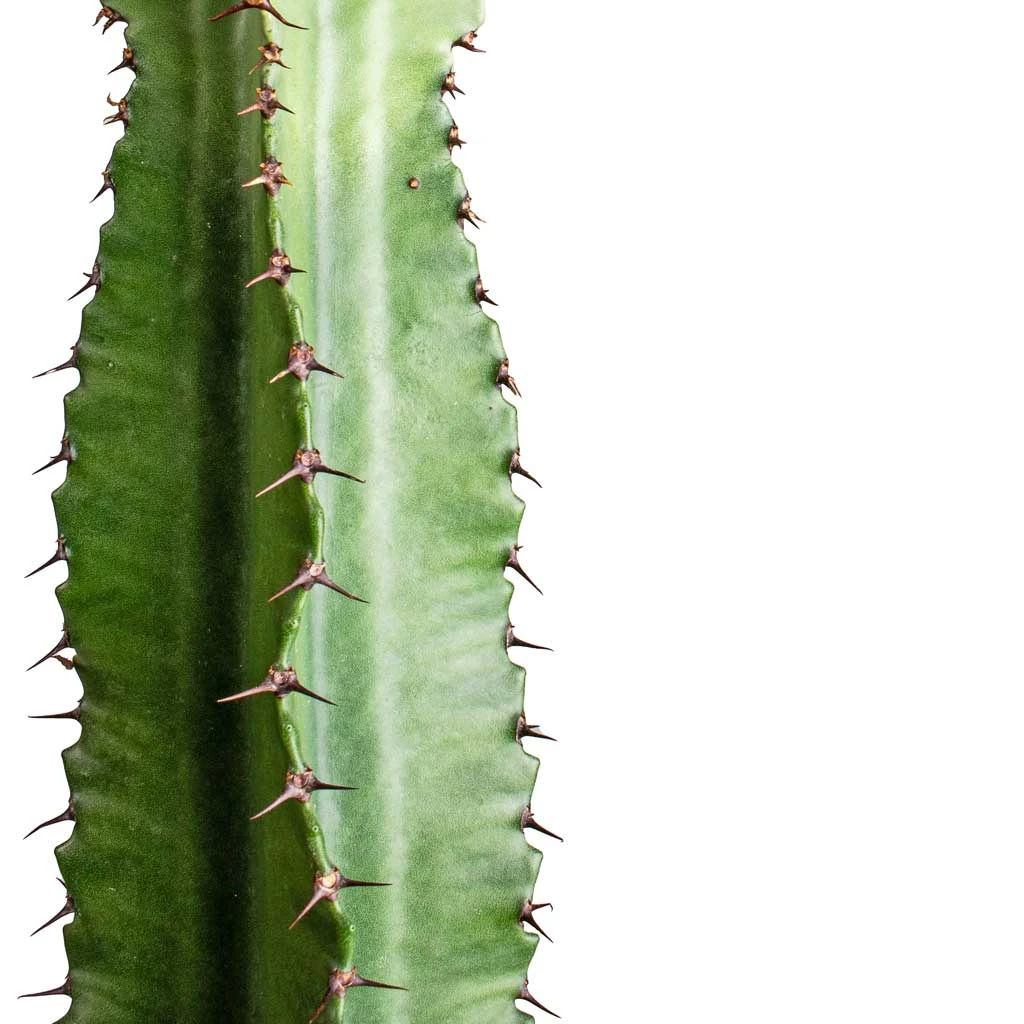 Another easy to care for addition to the succulent family, Euphorbia erytrea is an impressive presentation of living architecture. Capable of reaching heights of up to 2 meters indoors, this cactus displays a rippled, undulating silhouette with a serration of spines along its margins. A gathering of plantlets pinches in at the waist of the main stem, harkening back to the blazing arid climates of the Badlands.
