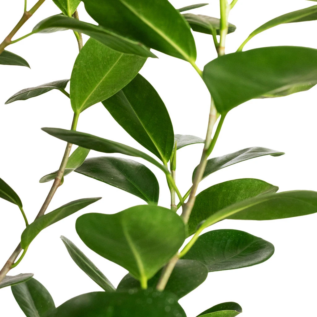 Ficus microcarpa Moclame has lovely, glossy oval leaves. It is easy to care for and is well known for filtering the air of pollutants, making it an ideal healthy plant for any home or office. The simple, natural beauty of the Ficus microcarpa Moclame adds an understated touch of the Indian subcontinent to your living space. It has many common names including Pot Belly Fig, Laurel Fig, Laurel Rubber, Curtain Fig and Strangling Fig.