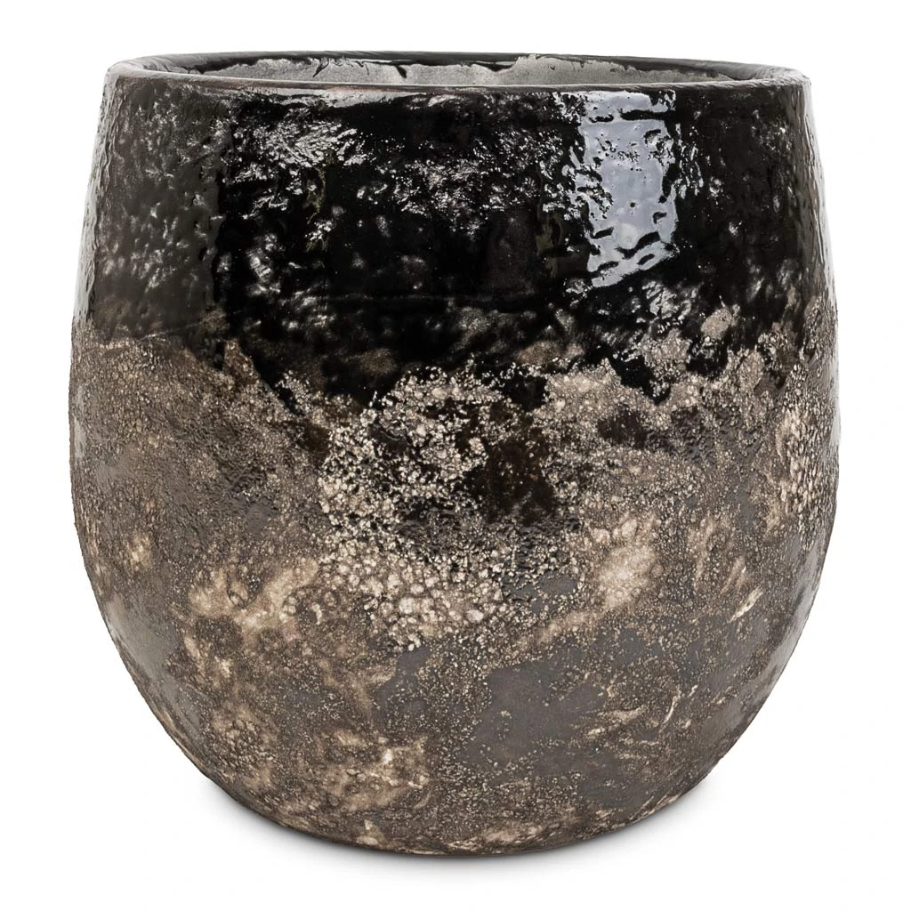 The Lindy plant pot is a unique piece of ceramic artistry. Deep inky black glazes blend with a rustic charcoal grey-washed glaze for a luxurious interior vibe.