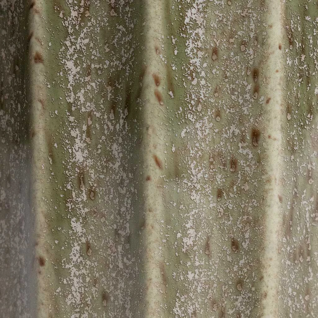 Featuring a vertical edge adorned with scalloped details and a stepped-in base combine with hues of sage, lichen and pea for a pop of colour and modern flair. It exudes a playful yet sophisticated vibe, enhanced by a reactive glaze that means each one is unique.