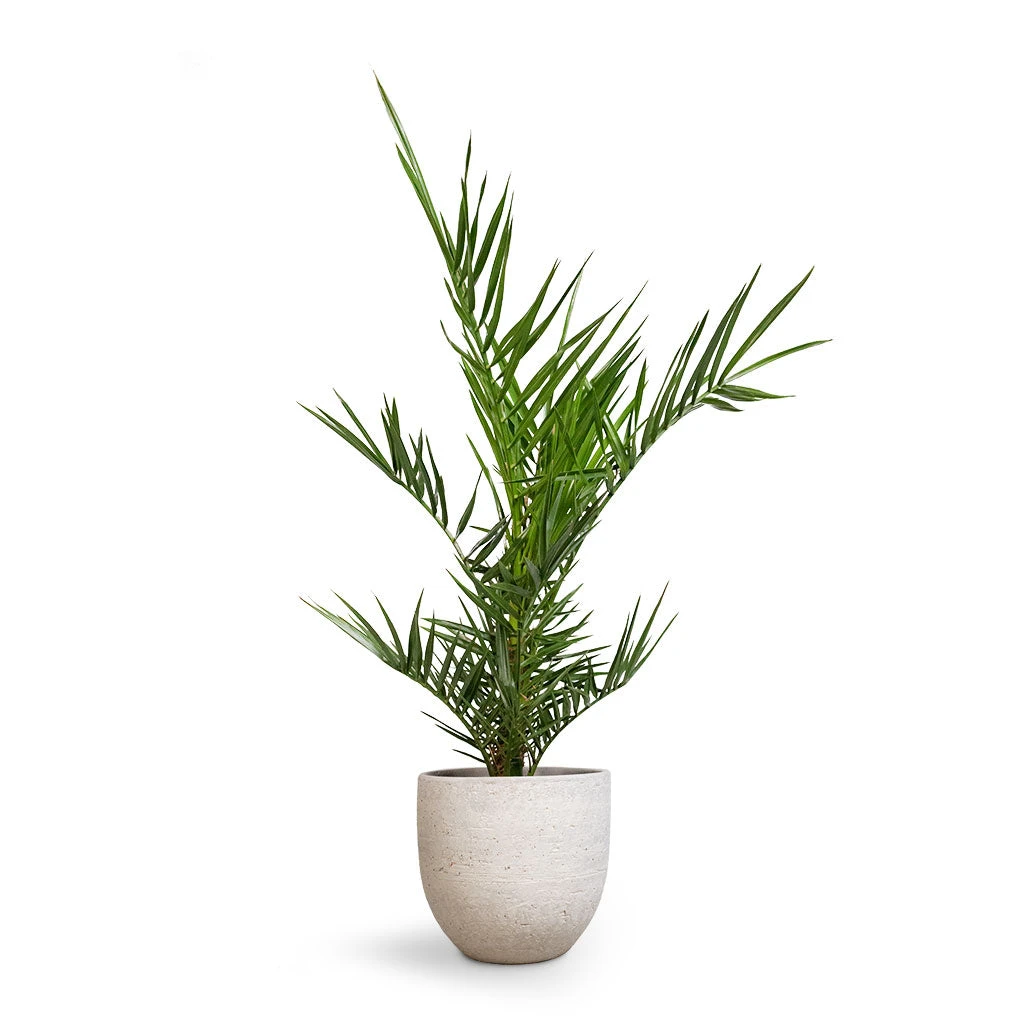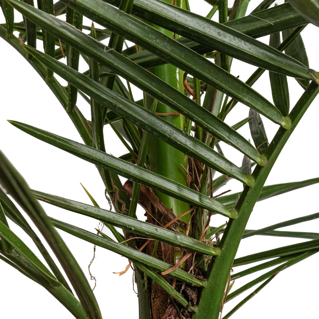 Bring the allure of the tropics to your living space with the Phoenix Canariensis, widely known as the Canary Island Date Palm. This exotic feather-type palm serves as a stunning focal point, whether placed in a sun-drenched corner of your living room or showcased on a stylish outdoor terrace.