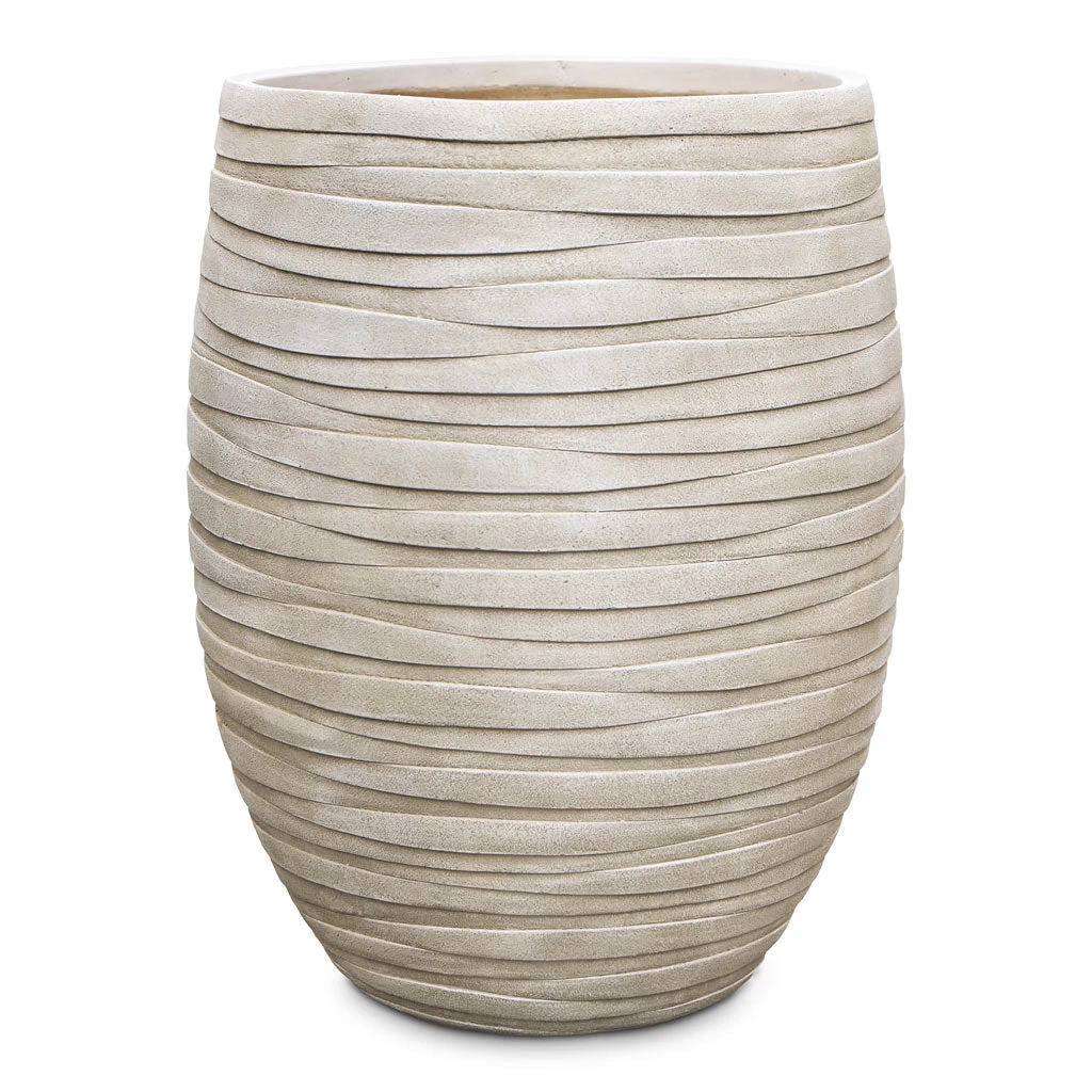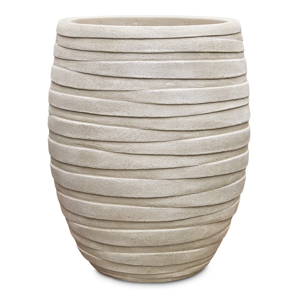 The Tornado collection brings soft bands of swirling energy and movement wrapped around the broad and balanced presence of the Emperor planter. Finished in a calming oatstone beige, this planter serves as a sophisticated focal point for any botanical display, blending sculptural art with functional gardening.
